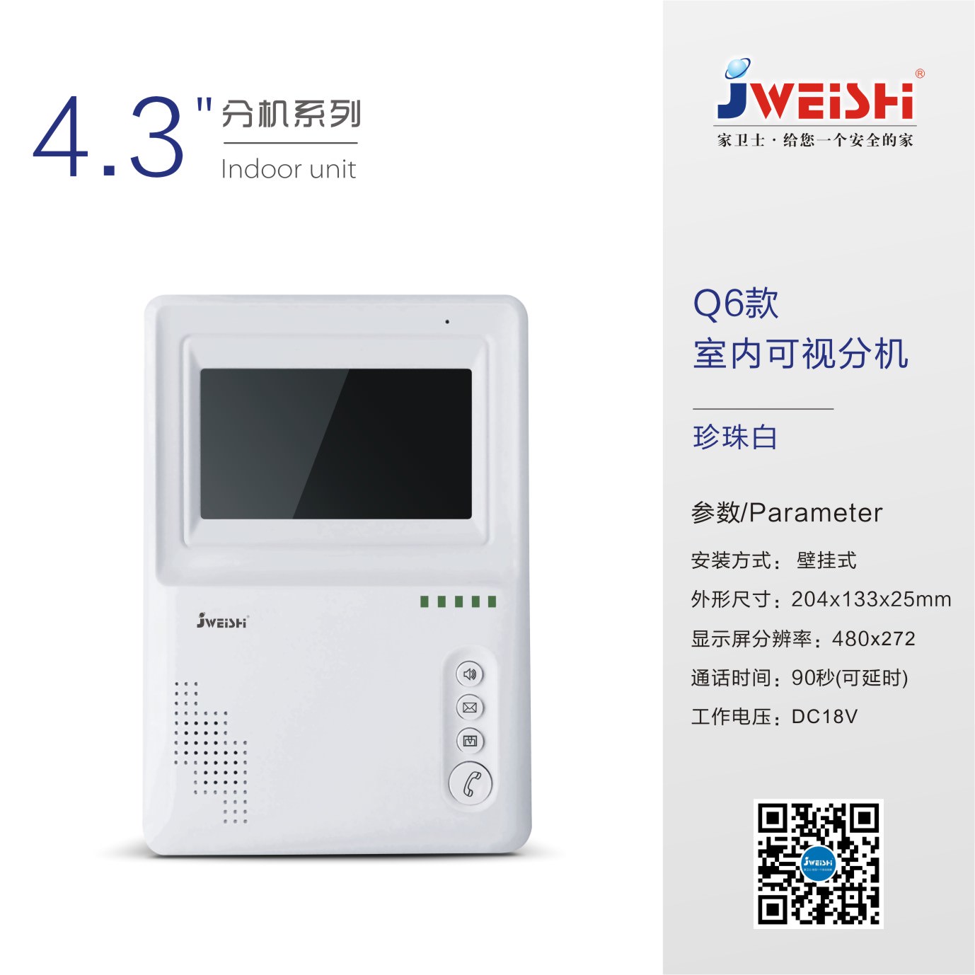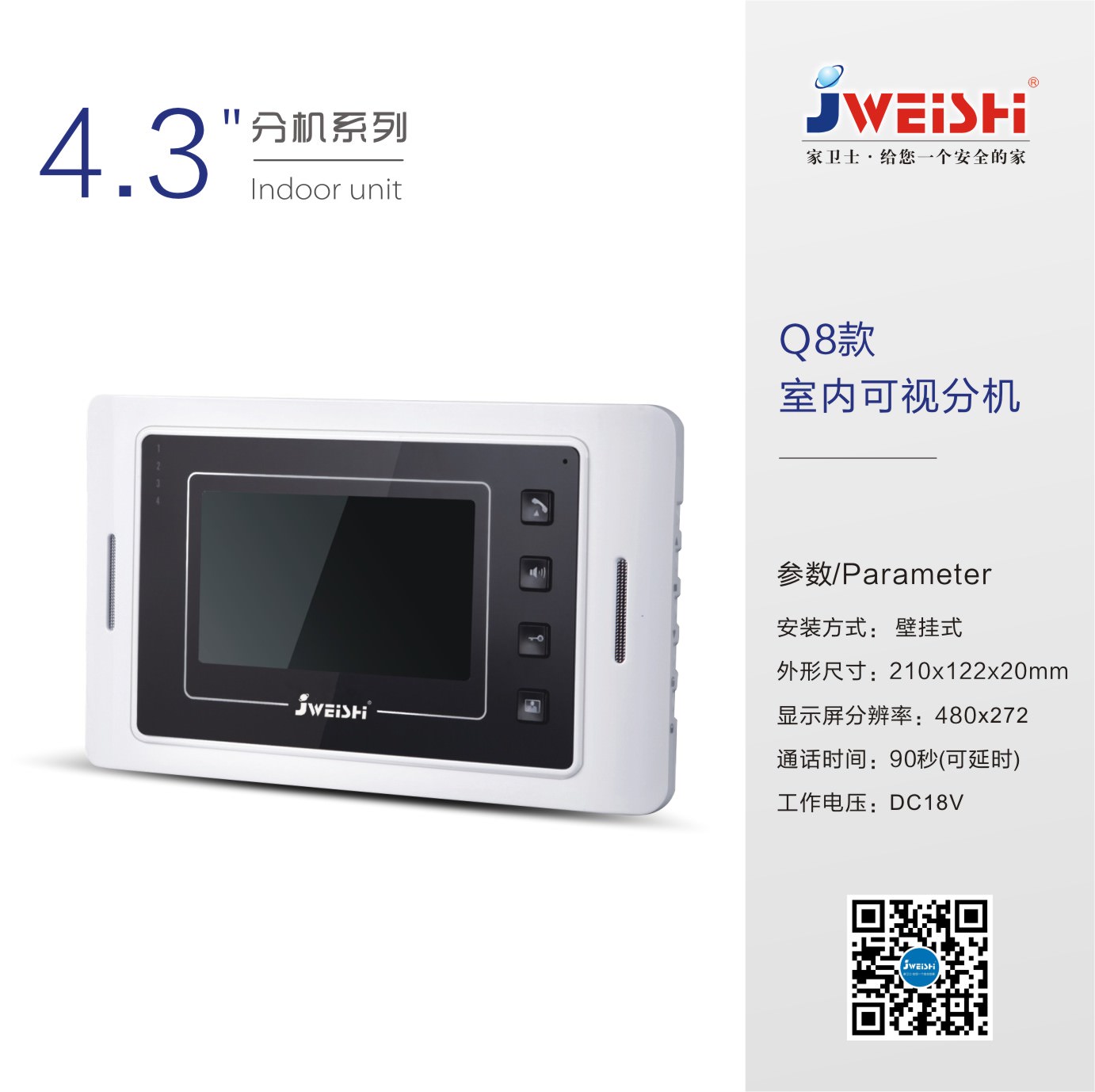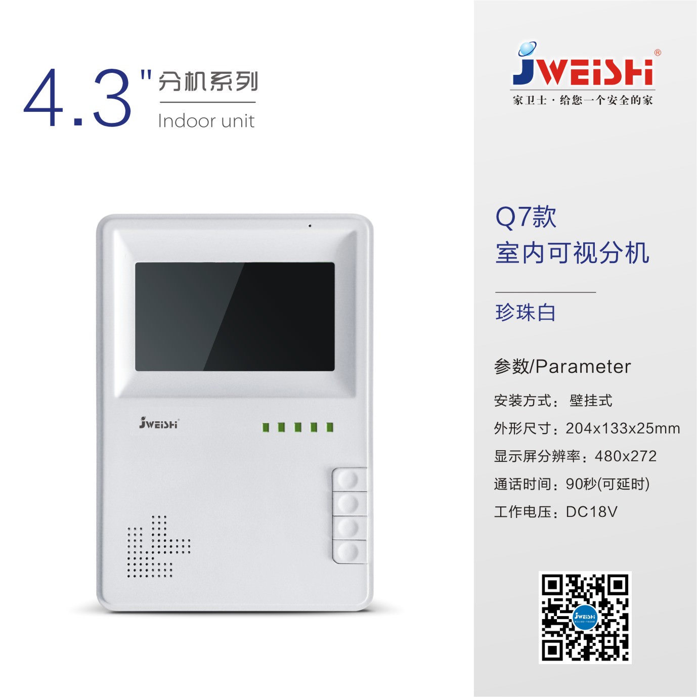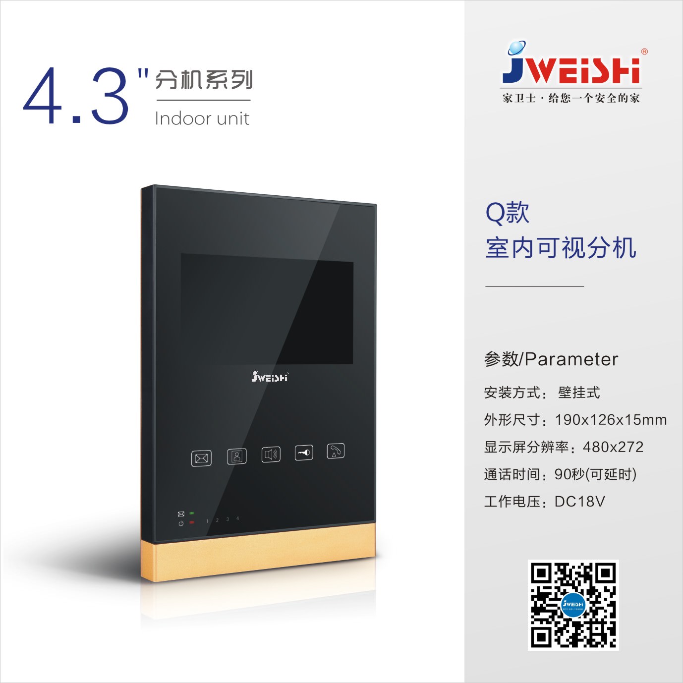 显示屏:4.3寸TFT显示屏分辨率:480*272安装方式:壁挂式 外形尺寸:190*126*13(mm)振铃时间:30秒通话时间:90秒(可延时)