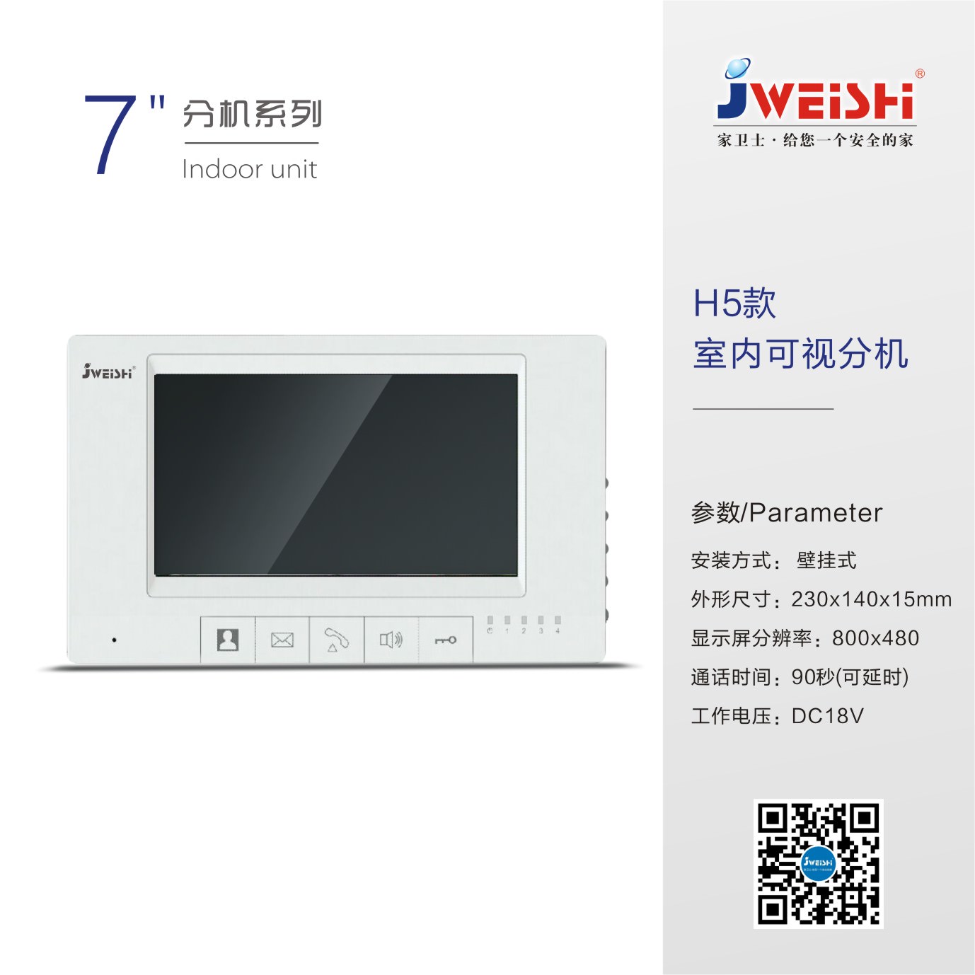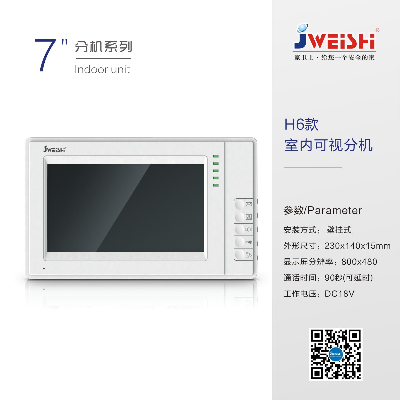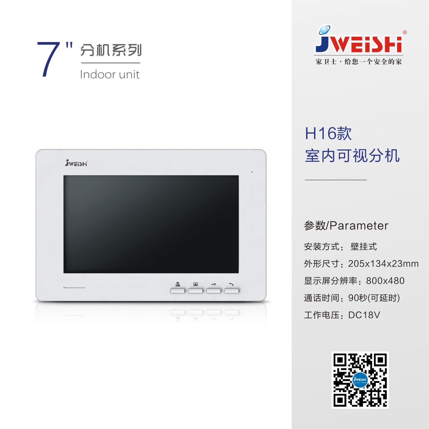 显示屏:7寸TFT显示屏分辨率:800*480安装方式:壁挂式 外形尺寸:245*150*10(mm)振铃时间:30秒通话时间:90秒(可延时)
