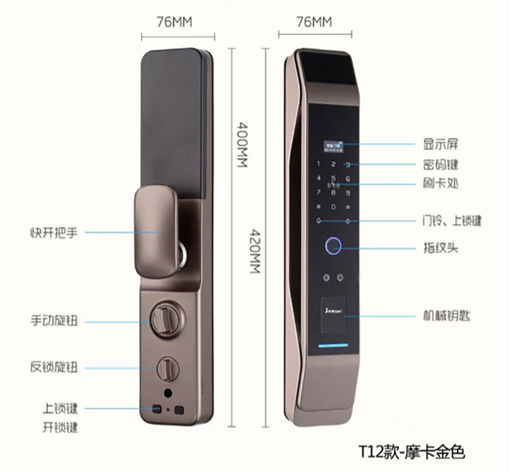 - 防撬报警、虚位密码防窥视、延时自动上锁、逗留抓拍、低电量报警、AI语音提示、支持多国语言