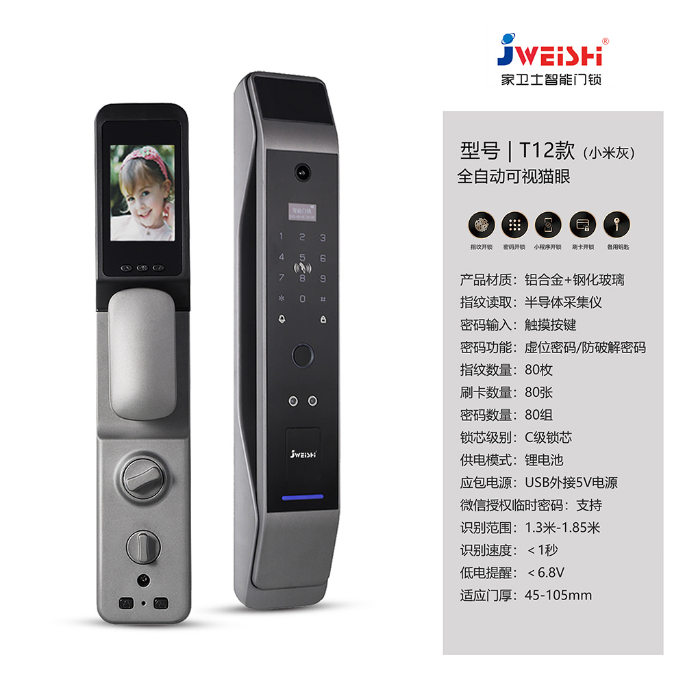 - 猫眼、防撬报警、虚位密码防窥视、延时自动上锁、逗留抓拍、主动监控、低电量报警、AI语音提示、支持多国语言