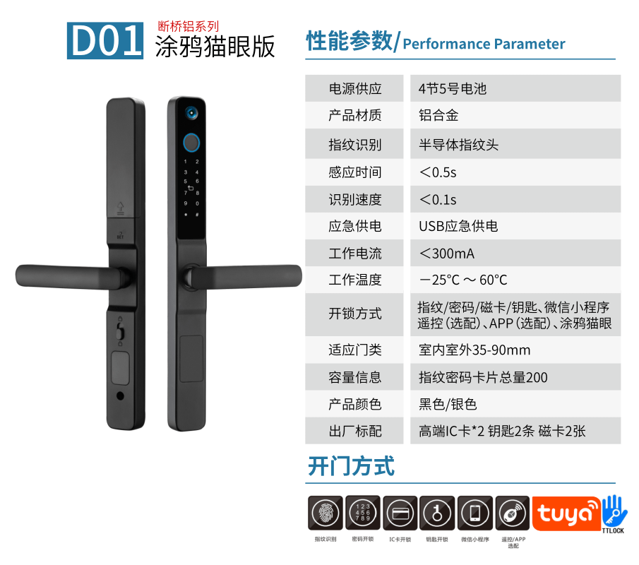 - 猫眼、防撬报警、虚位密码防窥视、试错报警、低电量报警、AI语音提示、支持多国语言、应急充电